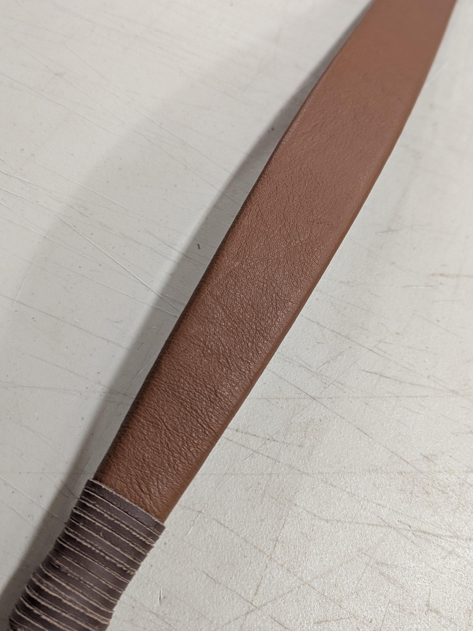 27# @ 28". Medium Brown Adult Scythian with brown stitching and grip. Strike plates on both sides of grip.