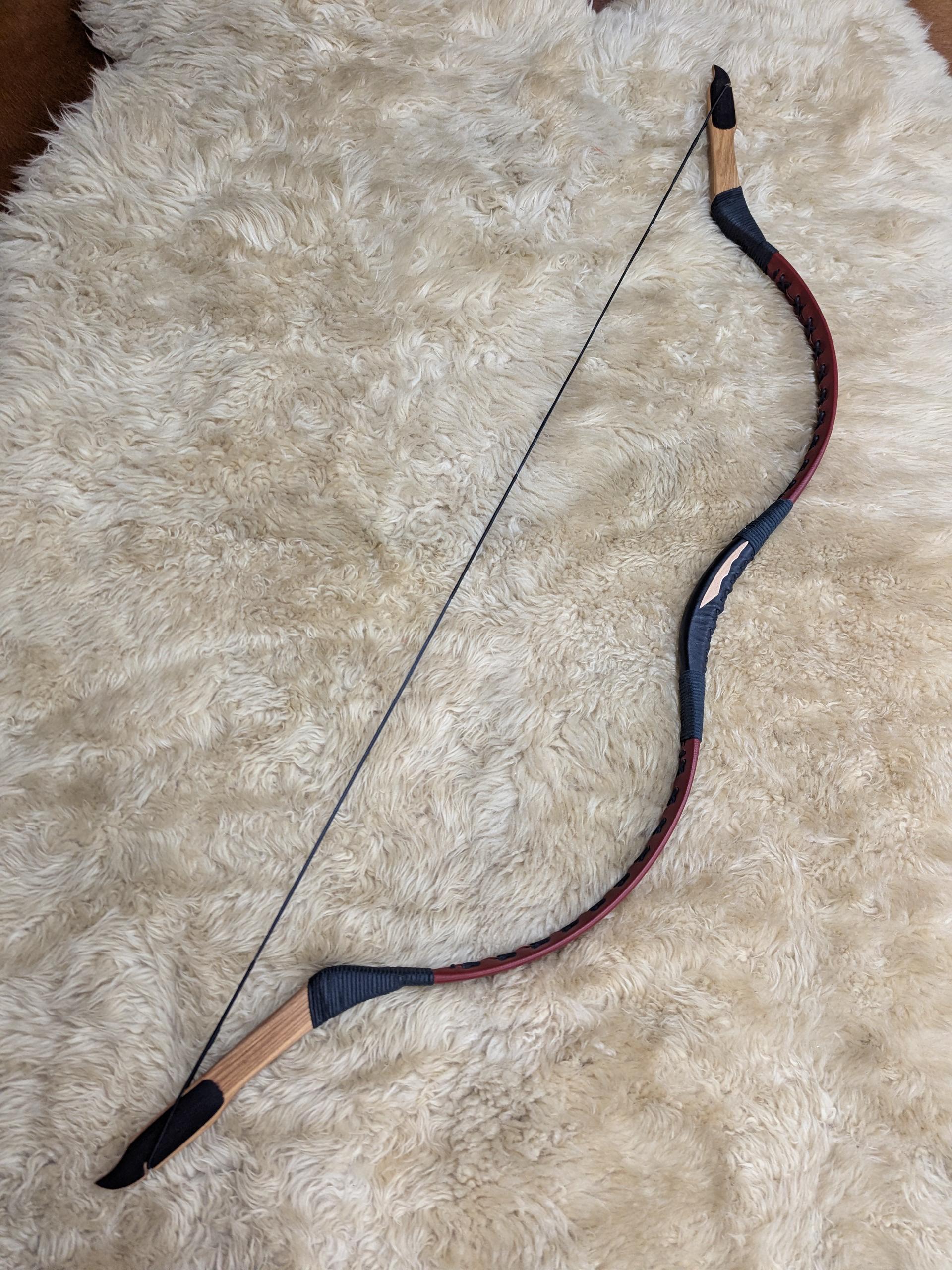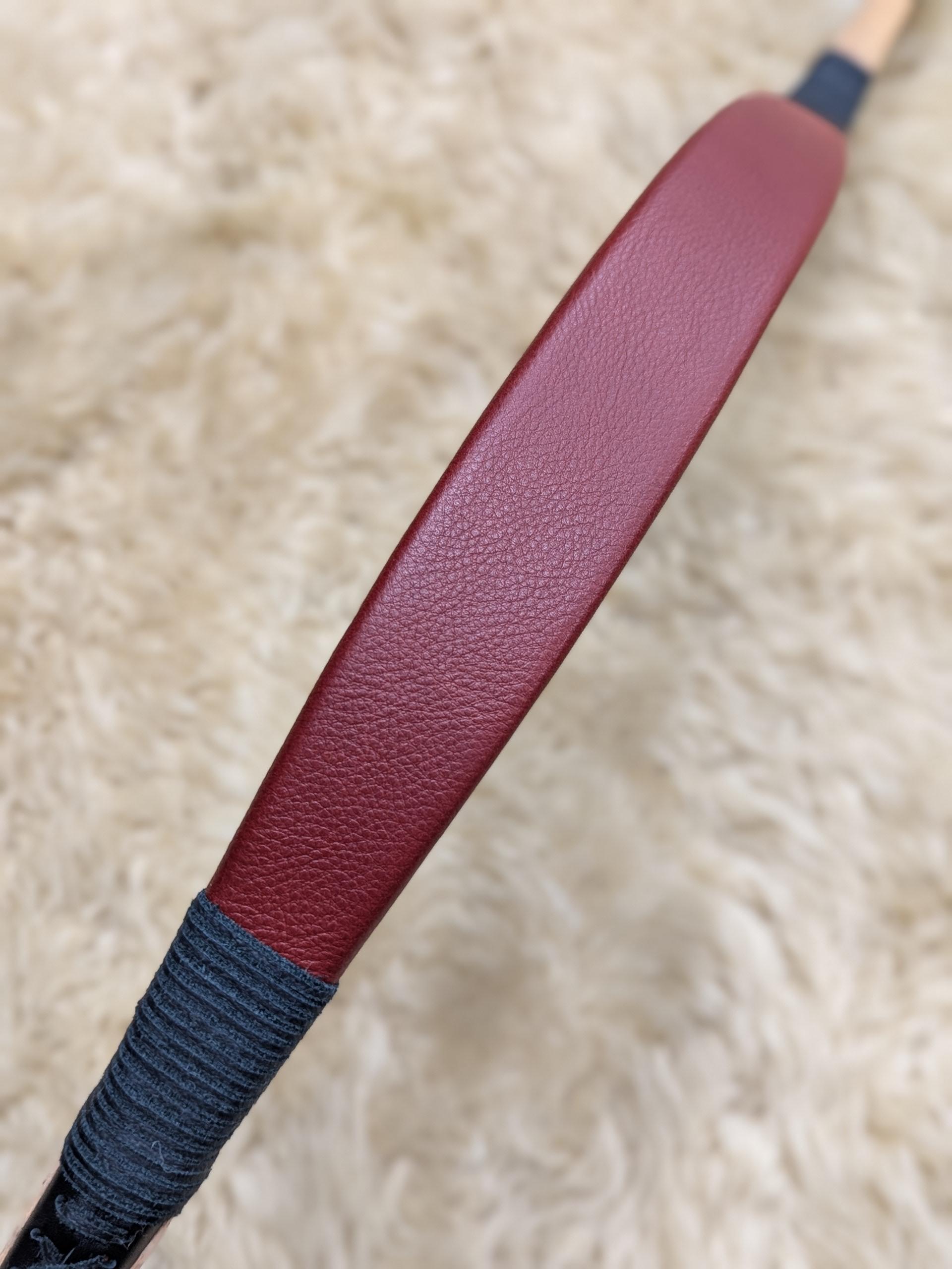 27# @ 28" (32# @ 30"). Red leather limb covering with black stitching and grip. Ash tips with wood laminate and wood strike plates on both sides of grip.