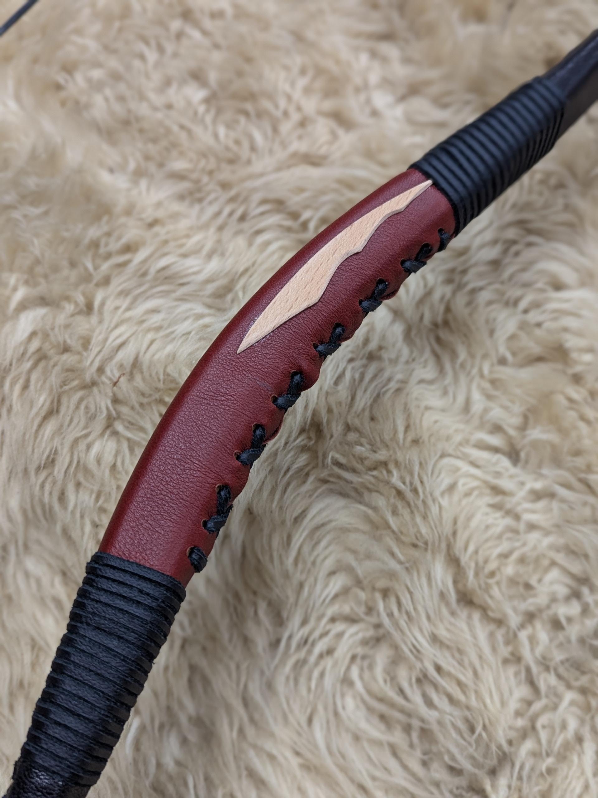 30# @ 28". Black limb covering with black stitching and red grip. Ash tips with wood laminate and wood strike plates on left side of grip for a right-handed shooter.