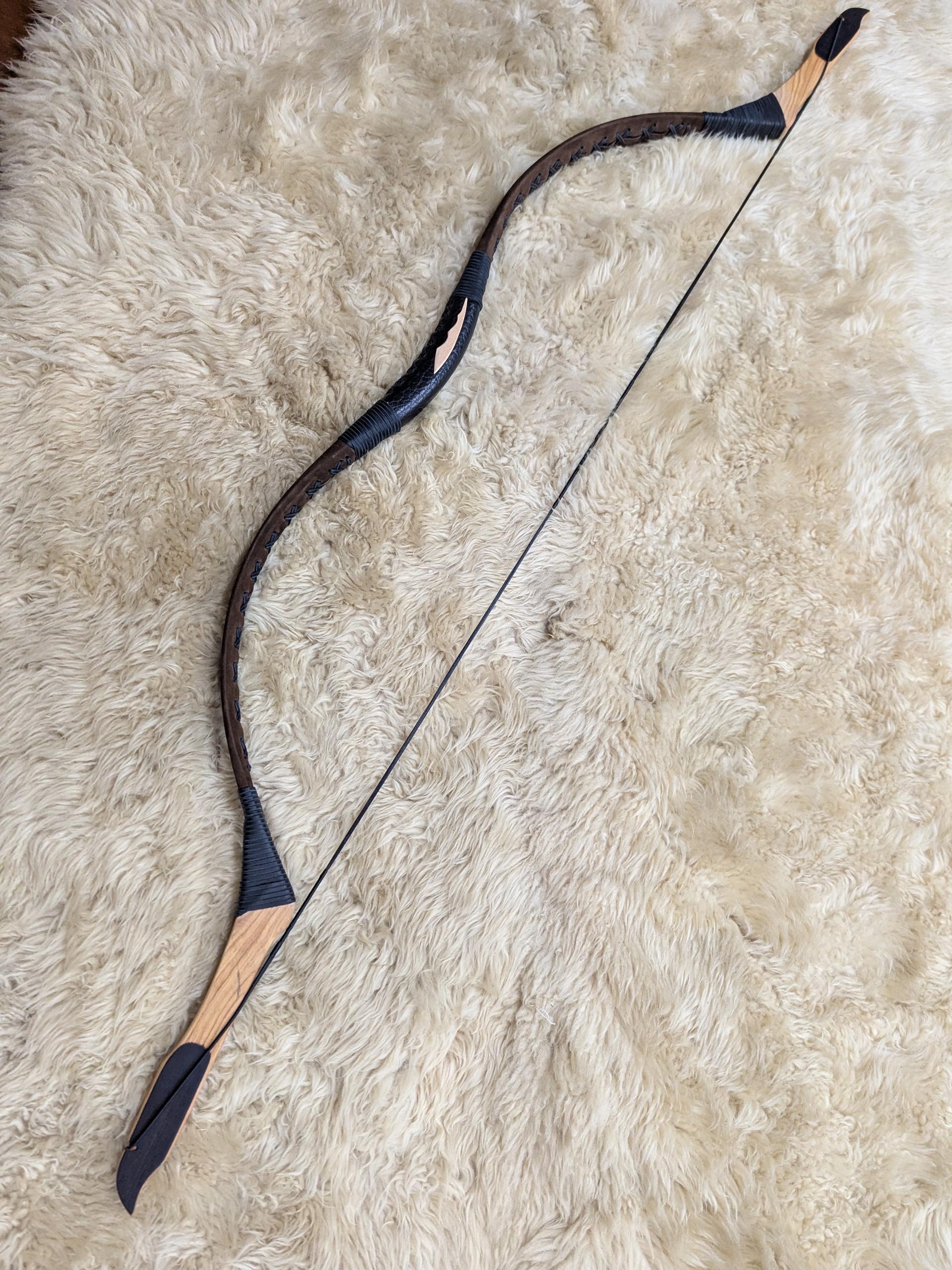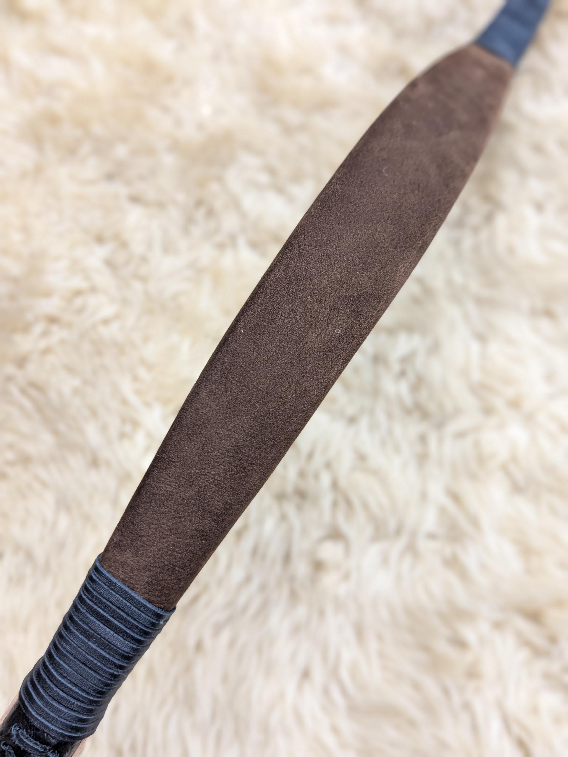 32# @ 28". Dark brown suede leather limb covering with black stitching and grip. Ash tips with wood laminate and wood strike plates on both sides of grip.