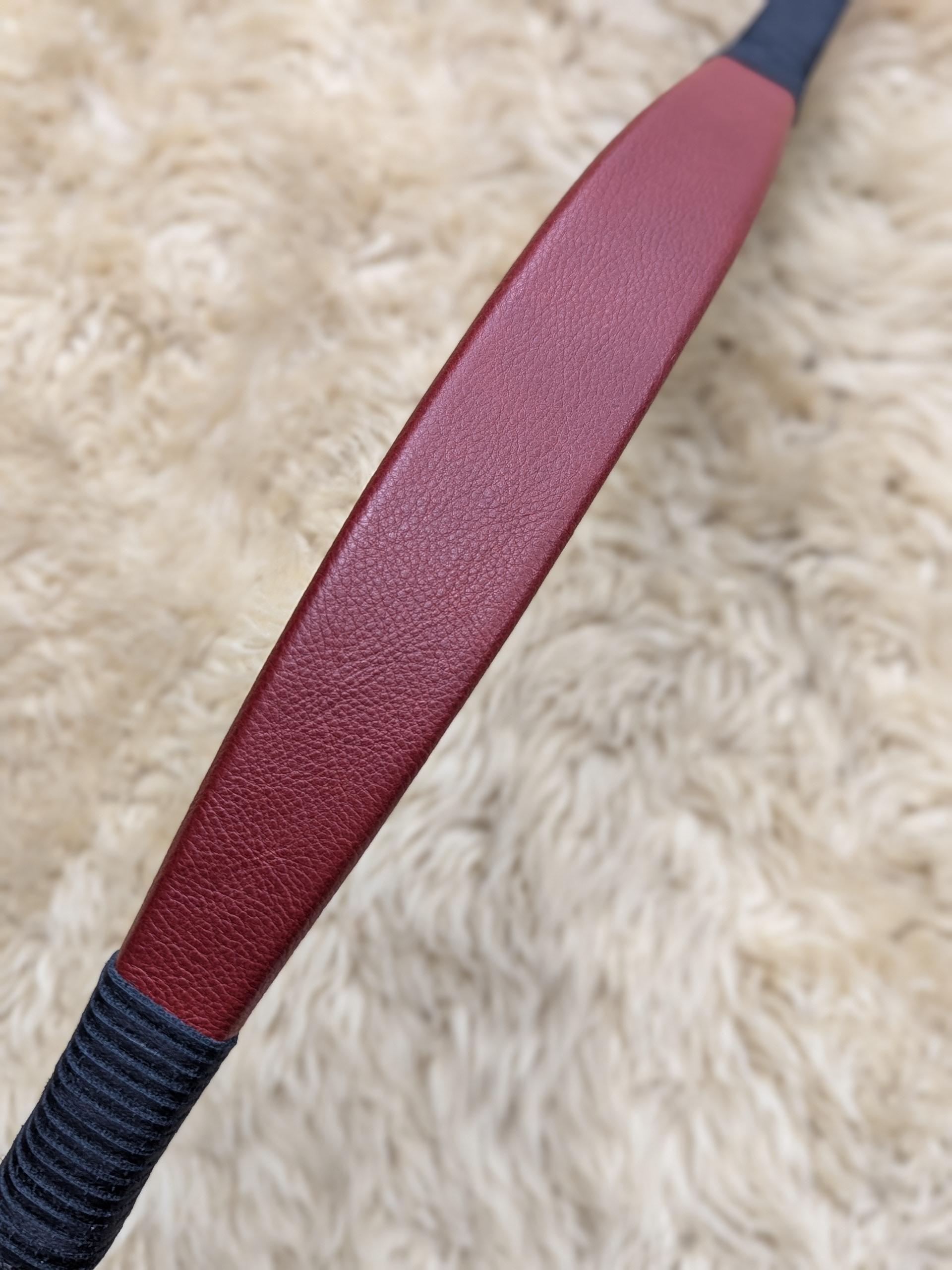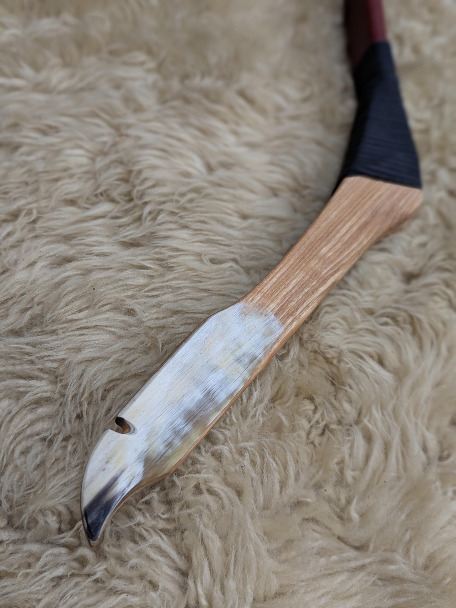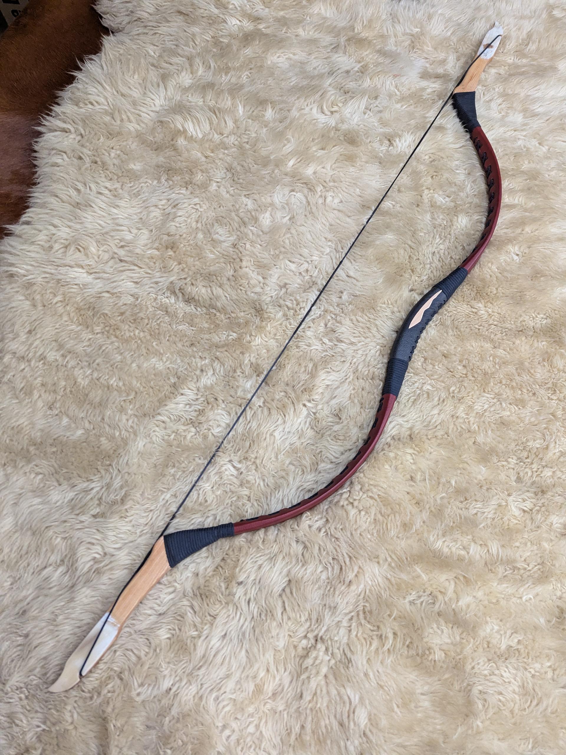 65# @ 28". Dark red covering with black stitching and grip. Ash tips with white horn laminate and wood strike plates on both sides of grip.